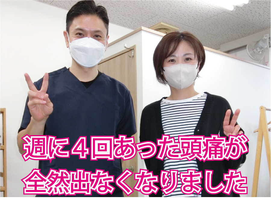 最初は週1回くらい頭痛も来ていましたが、そのたびに次回までどんな改善ができるか一緒に考えていただくうちに、その週1回が10日に1回と変化し、何より寝込むほどの痛みから解放され、通院3ヶ月経つ頃にはほぼ頭痛がなくなったと言えるぐらいに改善しました。