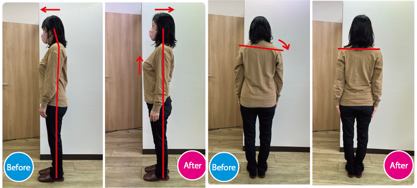 “ここまで歪んでいたんだ…”と正直ショックでした。でも、施術後に背中がふっと軽くなって、久しぶりに深く息が吸えたんです。
