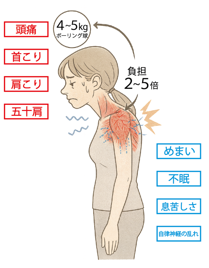 “姿勢の崩れ(猫背・頭が前に出る姿勢)” が原因です。