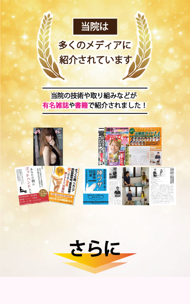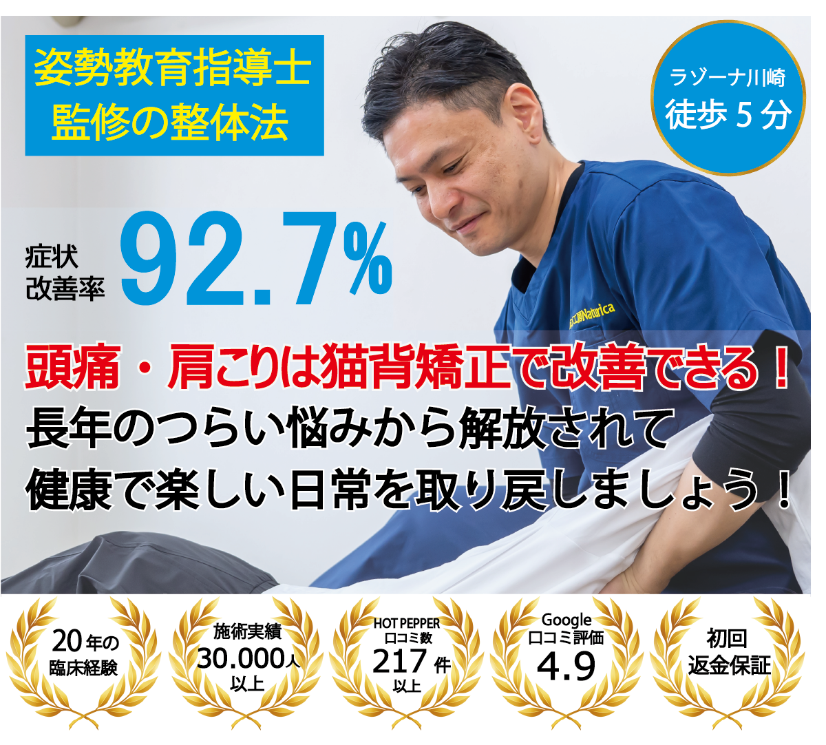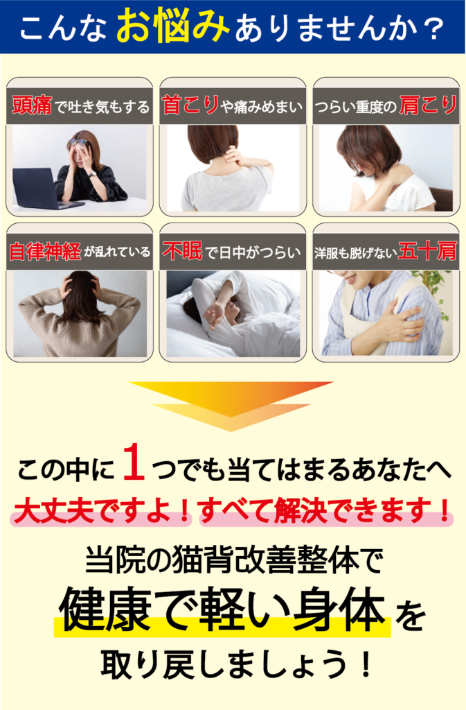 20年間、背部痛や腰痛、股関節痛、膝痛、足関節の痛みなど、いろいろな症状をみさせていただいてきましたので、頭痛や首肩以外にもお悩みがございましたらお気軽にご相談下さい。